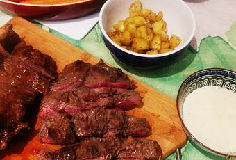 Pero volviendo al reto, como he dicho la inspiració me ha venido por el nombre. El Flat iron es un corte de carne que se empezó a poner de moda en en U.S.A. en los años 90. En algunos lugares de sudamérica se le conoce como punta de paleta y en España, o al menos en Madrid a la pieza la conocemos como pez.. Es una sección de la espaldilla que tiene un nervio central que tenemos que decir al carnicero que nos lo saque. El flat iron realmente es el corte de esa pieza una vez quitado el nervio central, en dos filetes que una vez macerados se hace a la plancha, aunque también se puede asar o hacer a la parrilla. Seguir leyendo...