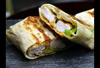 3.- Calentamos un poco las tortillas para poder cerrarlas bien (la primera no la calenté y se me rompió). Ponemos una capa de queso rallado y los solomillos de pollo.