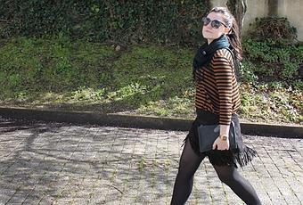 Today I show you a look in brown and black tones in which the protagonist is my new suede fringed skirt that I bought the last sale in Okeysi. This time I decided to combine with striped shirt in brown and black, boots and coat in brown bear, clutch and scarf in black.