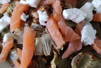 Llevarlas a la plancha hasta que se doren y después ponerle por encima queso feta desmigado y salmón ahumado.