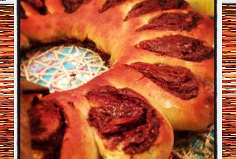 Cuando haya leudado lo suficiente estiramos la masa en un cuadrado de 50 cms x 35 cms y untamos con nutella la masa. Luego enrollamos la masa de forma longitudinal realizando un cilindro de unos 50 cms de largo y el cuál cerraremos haciendo una rosca.