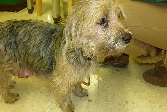 Tiene las tetas bastante inflamadas y colgando, por lo que debe estar recién parida, aunque de los cachorros no hay ni rastro.