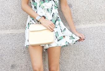 Me gusta pensar poco lo que me pongo cada día y no tener que pasarme horas escogiendo con qué lo combino, parte de arriba, de abajo, etc. así que por eso cada vez me estoy volviendo más fan de los playsuits ya que simplemente te los pones con un bolso y zapatos y listo. Este me gustó aparte de por su estampado tan veraniego por el diseño: es atado al cuello con escote de corazón para hacer una forma más bonita en la zona del pecho y además lleva una capa más por delante a modo de falda. ¿Qué os parece a vosotros? Como calzado escogí mis sandalias bicolor abiertas por delante y atadas al tobillo en nude y negro. Llevo mi bolso color maquillaje con cadena dorada y un reloj negro de piel como complementos. Ya sabéis, cuanto más sencilla, mejor.