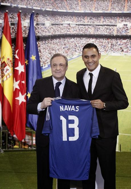 Florentino Pérez dio la bienvenida a Keylor Navas en al antepalco del Bernabéu. Este es un extracto del discurso del presidente del Real Madrid, que agradeció las facilidades ofrecidas por el Levante en la negociación y arengó al portero costarricense: “Tenemos una plantilla excelente pero tenemos que seguir creciendo. El fútbol es cada vez más competitivo. Trabajamos cada día para incorporar nuevos talentos que sueñan con ser parte de este equipo. Después de lograr la Décima que tanto deseábamos, tenemos retos singulares y especiales este curso”.“Hoy presentamos a uno de los mejores porteros del mundo, un hombre que ha demostrado su enorme profesionalidad y su capacidad de sacrificio. Tenía ofertas de los clubes más importantes de Europa pero quería jugar en el Madrid. Estás a punto de enfundarte la camiseta del Real Madrid, la primera vez que un costarricense la llevará en otros 112 años de historia. Los aficionados van a estar detrás de ti pero también esperan lo mejor de ti. No lo olvides. Quiero agradecer al presidente del Levante, Francisco Catalán, las facilidades que nos ha dado para que el fichaje sea posible”.