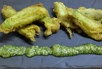 Poner una sartén con el aceite de girasol a calentar. Rebozar las flores y freír. Escurrir y poner en un plato con papel de cocina para absorber el aceite. Servir seguidamente acompañado de la salsa pesto. Esta receta puede tener muchas variaciones al gusto.