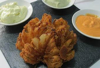 La cebolla si la dejas 20 0 30 minutos en agua con hielo, se te abren los gajos de la cebolla, yo no tenia tiempo, fui separando los gajos, con cuidado con las manos, la echas harina por entre todas las capas.