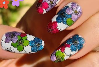 Como estáis viendo, de todas las flores del diseño coloreé sólo algunas, para dejar que las más grandes fueran blancas (al verse el color de la base). Elegí los tonos rojo, azul, lila y verde (todos son esmaltes holográficos menos el verde). Para el centro de las flores usé un amarillo. Fui cambiando el orden del coloreado de las flores para cada uña.
