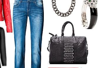 Para el día: Jeans, blusa negra semitransparente, chaqueta perfecto roja (que tanto me gusta), bolso de tachuelas negro y las gafas de sol.
