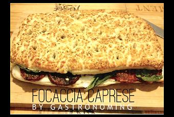 En esta receta, combinamos dos platos muy tradicionales de la cocina italiana, por un lado, la focaccia, hogaza en italiano, es un tipo de pan o base de masa pan de pizza muy típico de Liguria, heredados de los antiguos etruscos, de la cual existen varios tipos, siendo las más populares la de olivas y aceite y la fugàssa, con cebolla, por lo general acompañado con hierbas, por el otro, una ensalada caprese, típica de Capri, por eso el nombre, y está hecha a base de tomates, queso mozzarella y de albahaca de hoja ancha, hierba clásica de la zona. Nosotros hemos preparado la focaccia a modo de sándwich, como se acostumbra hacer fuera de Italia, en países, como Argentina por ejemplo. Receta sencilla, no por ello de llena de sabor, sabores fácilmente identificables con Italia, un receta que podemos tener preparada con antelación, ya que la podemos comer fría o caliente, aunque esta última es más recomendable, no esperes más y disfruta de este delicioso bocado, no te arrepentirás.