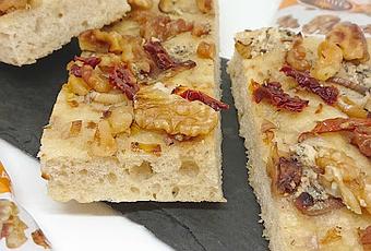 Sirve la focaccia en trozos individuales y riega con un poco más del aceite y con unas nueces para lograr un bocado crocante y fresco a la vez.