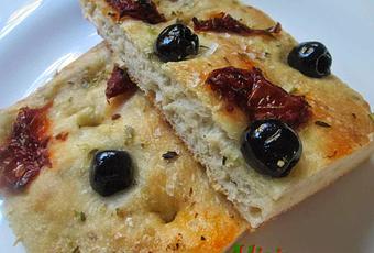 - Harina de fuerza para pan blanco 425 g.- Levadura seca de panadero 1 cda.- Sal fina 2 cdtas.- Orégano fresco o seco.- Pimienta negra molida ½ cdta.- Aceite de oliva.- Sal Maldon.- Tomates secos en aceite.- Aceitunas negras.