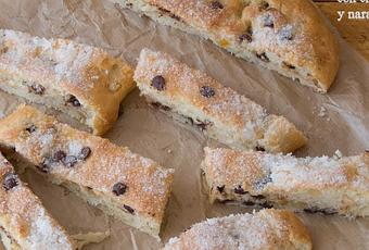 La focaccia es una especie de pan plano y es considerado como una delicia de la gastronomía de Liguria, denominada fugàssa en ligur. Una vez traducida la receta, que viene en italiano, vi que en sus ingredientes usaba harina y levadura normal. Además la receta lleva piñones y pasas (estas últimas prohibidas por mis hijas, uff no las soportan, y a mi me encantan).Me puse en contacto con Margot y le pedí permiso para tunear la receta. Permiso concedido.La he tuneado tanto que cualquier parecido con la original es pura coincidencia. 250 gr de harina de fuerza Preparación: En panificadora: Sacar la cubeta de la panificadora y colocar la leche, la sal, el azúcar, el aroma de azahar, la mantequilla fundida pero que no esté caliente, el huevo, y por último la harina con la levadura. Ponemos el programa de amasado de nuestra panificadora. De manera tradicional: Mezclamos los ingredientes secos y añadimos los ingredientes húmedos. Cuando haya levado, incorporamos la naranja y las gotas de chocolate, integramos con las manos. Encendemos el horno para que se precaliente a 180 grados, sin ventilador. Mientras dejamos que la masa repose.