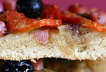 - Poner los ingredientes elegidos: cebolla frita, tomate natural en rodajitas, aceitunas negras, orégano y anchoas (éstas colocarlas cuando la focaccia ya esté prácticamente cocida, pues de lo contrario quedarán resecas y demasiado saladas).
