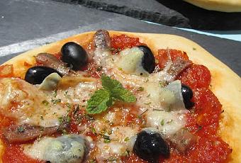 4- Dividir la masa en 4 trozos, estirar, poner una cucharada sopera de tomate en cada focaccia, repartir las anchoas cortadas por la mitad, aceitunas y lascas de queso parmesano. Dejar reposar mientras se precalienta el horno a 220º.