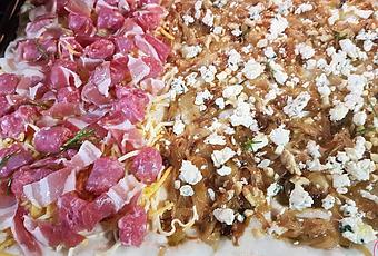 Distribuimos la cebolla en la mitad de la foccacia, sobre la cebolla colocamos el queso en trocitos y las nueces también troceadas.