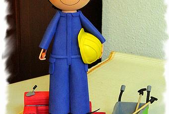 Cuando me llegó este encargo de fofucha me sorprendí porque, seamos realistas, por mucha igualdad entre sexos que queramos vivir, el oficio de albañil no es de lo más escogidos por las mujeres. Pero mirad por donde, Mil Delicias se ha topado con una. :) Este miniyo fofucha sí que tenía unas directrices muy concretas para hacerla: pelo recogido en una coleta, casco, un ladrillo, un carretillo y una pala. Así que para qué lo vamos a hacer tan fácil. El ladrillo acabó siendo el comienzo de una pared con cemento y paleta incluida, a la pala le terminó acompañando un pico y ya que estamos un bocadillo en la mano para almorzar. De rico jamón serrano que hay que cuidarse bien.Y la fofucha Bego se da por terminada.