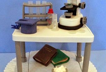Y este es el último trabajo de un encargo en el que tenia que hacer un detalle que no fuera una muñeca para tres estudiantes que habían terminado su carrera. Esta es para un licenciado en química.. he representado una pequeña mesa de laboratotio, y como no también su birrete azul, característico de químicas.