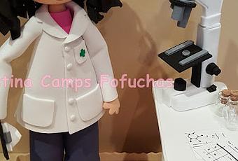 A Paula le han regalado sus compañeros y amigos esta fofucha de laboratorio. Va con una mesa, su microscopio y utensilios de laboratorio.
