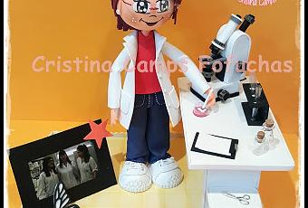 Hola a tod@s! ¿Como va el frío? a 14 grados en Barcelona. Abrigadita y trabajando en el taller, espero que aunque cuesten los lunes estéis disfrutando del día. Os dejo esta fofucha doctora, en su laboratorio. Le he puesto una mesa de trabajo y algunas de sus herramientas habituales. también me pidieron que llevara un pequeño marco con la foto de sus compañeras. Medidas:25cm