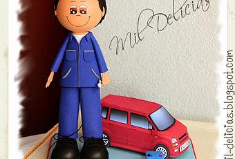 Quien me sigue de continuo sabe que me gusta hacer cosas diferentes y con los fofuchos me encuentro feliz porque rara vez hago dos encargos iguales. Maestras, informáticas, carpinteros, niños y niñas de Comunión, pasteleras, pintoras... todo es posible y deja volar la imaginación. Hay ocasiones que la persona que hace el encargo de una fofucha tiene muy claro lo que quiere y te da hasta el último detalle. Pues eso me encanta. Y hay otras veces que sólo te dicen el tema que quieren de fofucho y dan via libre a lo que se me ocurra. Pues eso también me gusta. Eso sí, otras veces piden algo difícil de verdad y tristemente he de decir que no. Pero hasta ahora eso ha ocurrido sólo en un par de ocasiones y me fastidió decir que no porque fueron dos retos que me ganaron y no pude con ellos. El de esta semana ha sido relativamente fácil, salvo por el coche que dio la lata más de lo debido. Pegar cada cosa en su sitio no fue fácil y que quedase como debía más difícil aún. Pero después de tres intentos salió. Y sin más que añadir, os presento al fofucho Goyo, un mecánico excepcional que te hace la puesta a punto del coche en un periquete y con un trato de lo más profesional.
