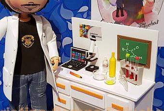 El fofucho de hoy es un químico farmacéutico llamado Dani. Va acompañado de una mesa con todos los utensilios que suele utilizar.
