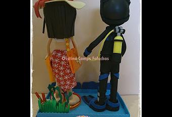 Elisabet me encargo para obsequiar a algunos de sus amigos, en el día de su boda, unas parejas de fofuchos. Hoy os presento la primera. Os dejo a Joaquín y marta, él vestido de submarinista una de sus aficiones y ella con un look muy playero. Ha sido divertidísimo hacer estos muñecos. ¡Muchas felicidades a la pareja de recién casados!
