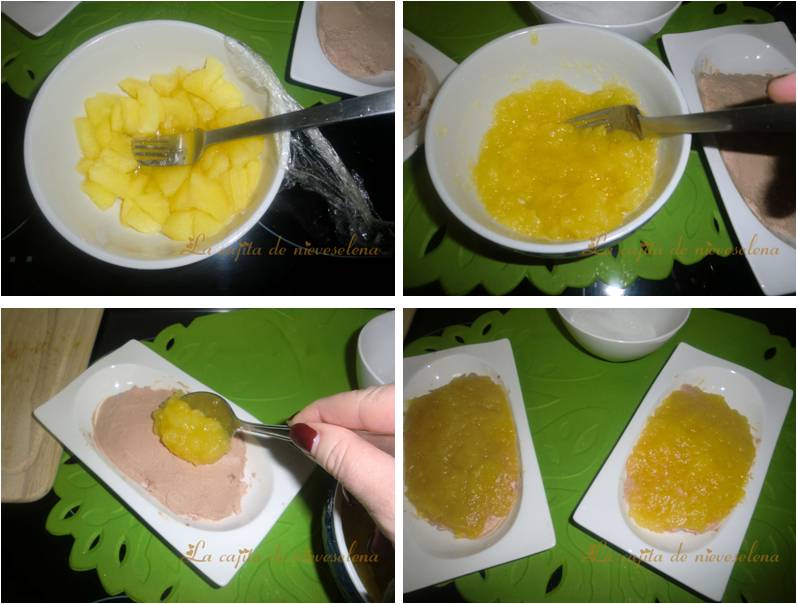 Nos queda una compota que aplastamos con un tenedor y cubrimos con ella la mousse de foie. Dejamos enfriar.