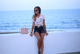 Esta camiseta me encantó cuando la vi porque aparte de ser un básico desde ahora para mi armario por su color rosa palo combinable prácticamente con todo, las frases motivadoras que lleva escritas me alegran también el día. La combiné con shorts negros y mis nuevas sandalias negras con tachuelas que me encantan por lo cómodas que son. Realmente se cumple eso de cuanto más sencillos, mejor, ¿no creéis?