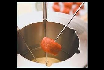 Llenamos la fondue de aceite de oliva hasta la mitad y calentamos .