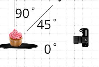 Este esquema muestra que la cámara puede estar ubicada desde los 0 grados a ras de la superficie (o incluso menos aunque no es común verlo) hasta 90 grados lo cual crea una vista aérea del plato (ese tipo de toma se denomina cenital). Dependiendo del tipo de comida y la forma en que la hayamos dispuesto unos ángulos funcionaran mejor que otros.