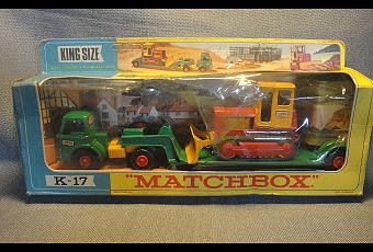 El paso del tiempo, y la caja donde están los Matchbox King Size, rompieron el plástico transparente de la caja original del modelo K-17. Algunos autos de esta serie venían con una especie de escenario de fondo. Para que lo aprecien en su total magnitud es que le saqué una fotografía aparte. Si prestan atención verán las marcas de la bandas de gomas sobre la plataforma del remolque.
