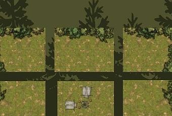 Es conjunto de nueve mapas como el que se ve en la imagen, de 11" x 8" de un gran claro en el bosque con un pequeño campamento en el centro. Sencillo y efectivo. Es totalmente genérico y vale para cualquier juego de rol. Se pueden usar los mapas sueltos o formando un gran mapa.
