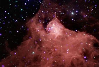 En ésta imagen compuesta, combinando datos del Observatorio de rayos X Chandra y el telescopio espacial Spitzer, se muestra la nube molecular Cepheus B, que se encuentra en nuestra galaxia, aproximadamente a 2.400 años luz de la Tierra. Una nube molecular es una región que contiene gas frío interestelar y polvo sobrante de la formación de la galaxia y en su mayoría contiene hidrógeno molecular. Los datos de Spitzer, en rojo, verde y azul muestra la nube molecular en la parte inferior de la imagen, además de estrellas jóvenes en las proximidades de Cepheus B, y los datos de Chandra en violeta muestran las estrellas jóvenes en el campo de visión. Las observaciones de Chandra permitieron a los astrónomos escojer estrellas jóvenes dentro y cerca de Cefeo B, identificadas por sus fuertes emisiónes de rayos X. Los datos de Spitzer muestran si las estrellas jóvenes tienen un disco protoplanetario alrededor de ellas. Tales discos sólo existen en pequeños sistemas planetarios donde aún se están formando, por lo que su presencia es una indicación de la edad de un sistema estelar.