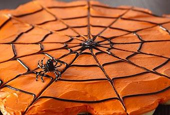 Organice los cupcakes en un gran plato redondo o plato para pizza. En un tazón mediano, mezcla unas gotas de colorante con el frosting. Propague el frosting sobre los pastelitos como en la foto. Exprimir un gran punto de glasee negro en el centro de frosting. Con el glasee, dibujar círculos hacia abajo concéntricos alrededor del punto. Para crear el diseño se telaraña, arrastre un palillo en el punto central hacia el borde exterior del círculo. Colocar arañas de plástico en la telaraña. Refrigere hasta servir.