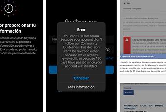 Este es el mensaje que suelen enviar a usuarios de habla hispana:No puedes solicitar una revisiónSi recibes este mensaje NO SE PUEDE HACER NADA. Comprendo que es frustrante pero ya no podrás enviar más formularios ni mensajes y la información estará perdida. No hay nada ni nadie (desconfía de todos los que cobren por realizarte gestiones de recuperación) que puedan ayudarte con la recuperación de la cuenta.