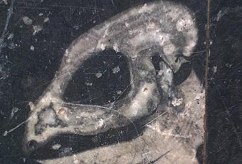 El fósil más espectacular que he encontrado en la ciudad de Uvieu es el que podéis ver en la foto anterior. Se trata de un corte del cráneo de una tortuga de unos 10 cm de largo en el que se aprecia perfectamente el pico, la cuenca del ojo e incluso los huevos del juego de las mandíbulas.