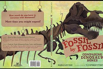 Tras la edición de "Bone by Bone: Comparing Animal Skeletons" (2014) y "Tooth by Tooth: Comparing Fangs, Tusks, and Chompers" (2016), ambos en Millbrook Press TM, la veterinaria y divulgadora Sara Levine y el ilustrador T.S Spookytooth publicaron en 2018 el libro "Fossil by Fossil: Comparing Dinosaur Bones". Siguiendo con la fórmula planteada en sus predecesores, los autores proponen un viaje al pasado para comparar la anatomía humana con la de los reptiles mesozoicos. Con la ayuda de varios niños de diversas culturas que acuden a un museo, van señalando semejanzas y diferencias entre cráneos, vértebras, costillas y extremidades de estos animales extintos con faunas actuales y con el propio cuerpo humano. A continuación, dejamos un ejemplo de lo que puedes encontrar en el interior del libro: