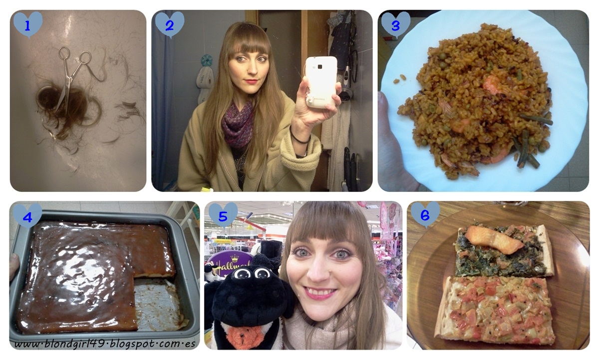 1. Masacre en el baño :P2. Resultado de la masacre xD ¡flequillo! En un principio me lo corté ladeado pero me quedaba TAN MAL que me hice un arreglo para cortármelo recto jajaja3. Paellita ¡hacía mil que no preparaba!4. Tarta de wherter's, nunca había probado algo similar, ¡estaba de muerte! no duró ni 2 días :S (y eso que somos 2 en casa, aunque le guardé un trocín a mi chico xD). Os publicaré más adelante la receta5. ¡Un muñeco me ha plagiado la mirada!6. Coques de trampó de la panadería, cenita en casa del nene aunque antes también iba un plato de sopa :). Yo la suelo hacer casera y os enseñé aquí la receta