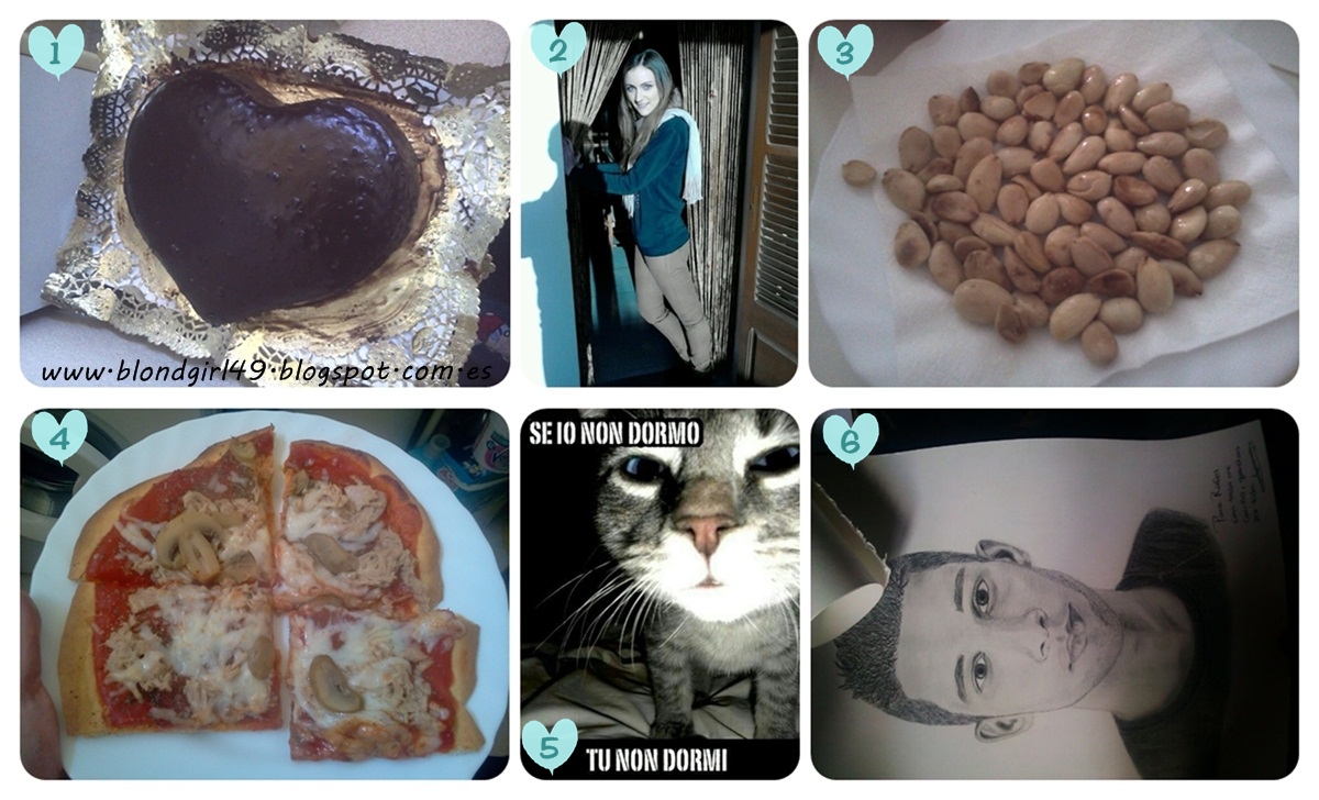 1. Este es el pastel de san Valentín que le hice a mi chico(L), os enseñé ayer la receta (aquí)2. Fotito en casa del nene, uno de esos días en que sale el sol y parece un milagro xD3. Almendras crudas que las freí con aceite y sal, qué ricas!4. Pizza para comer(L), os hice una entrada sobre todos los tipos de masas que hago^^ aquí podéis verla.5. Se io non dormo, tu non dormi jijiji6. Retrato que le hice a un amigo al que quiero mucho^^, debe tener ya 5 años este dibujo xD (me pasó él la foto al encontrarlo por casa de sus padres^^), espero que no le moleste que la publique jajajaja ¡¡¡Xurrito eres muy grande!!!