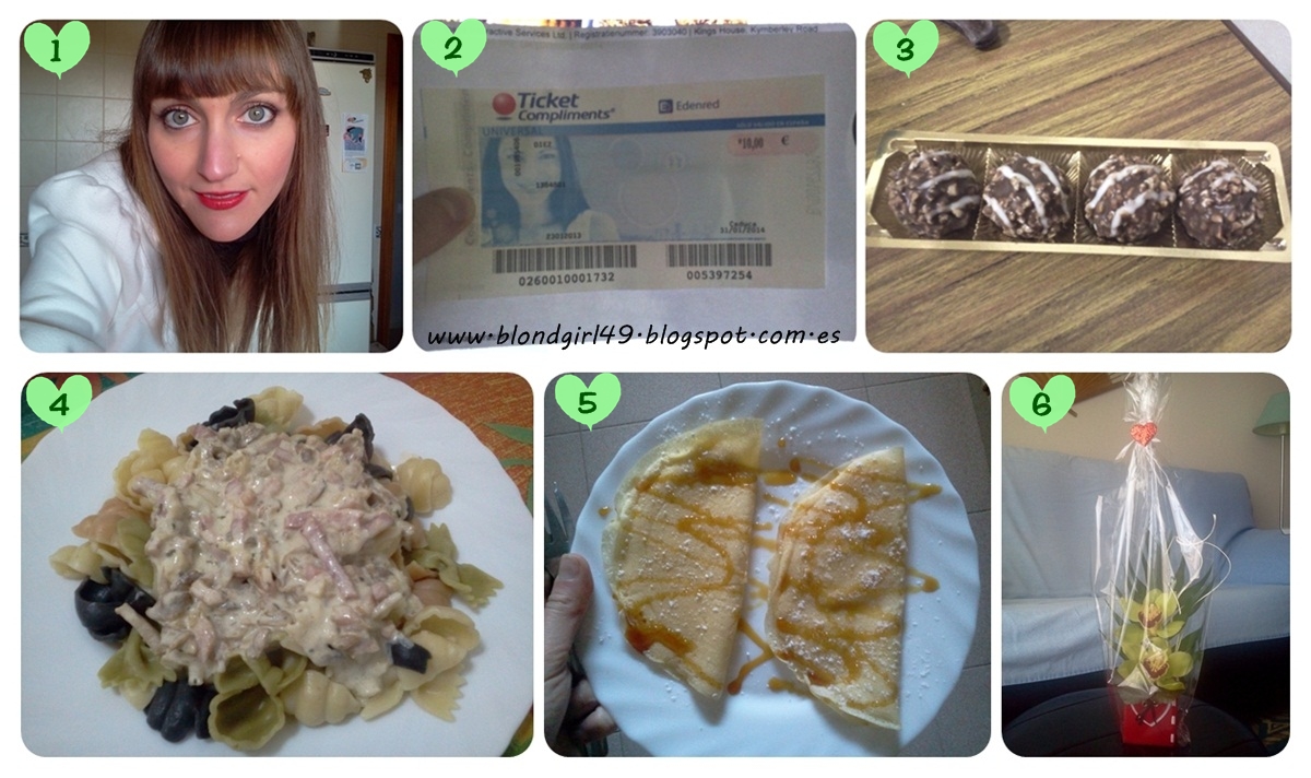 1. Fotito en casa de mi chico :)2. Otro vale de tícket compliments^^, os conté con qué webs los conseguía en esta entrada 3. Encontrar bombones tipo Ferrero Rocher a 0.50€ (oferta de Müller) no tiene precio :P4. Pasta con salsa de nata especial(L)5. Crepes!! Ls mías de choco blanco con caramelo por encima jijiji6. Orquídeas que me regaló mi padre por san Valentín :)