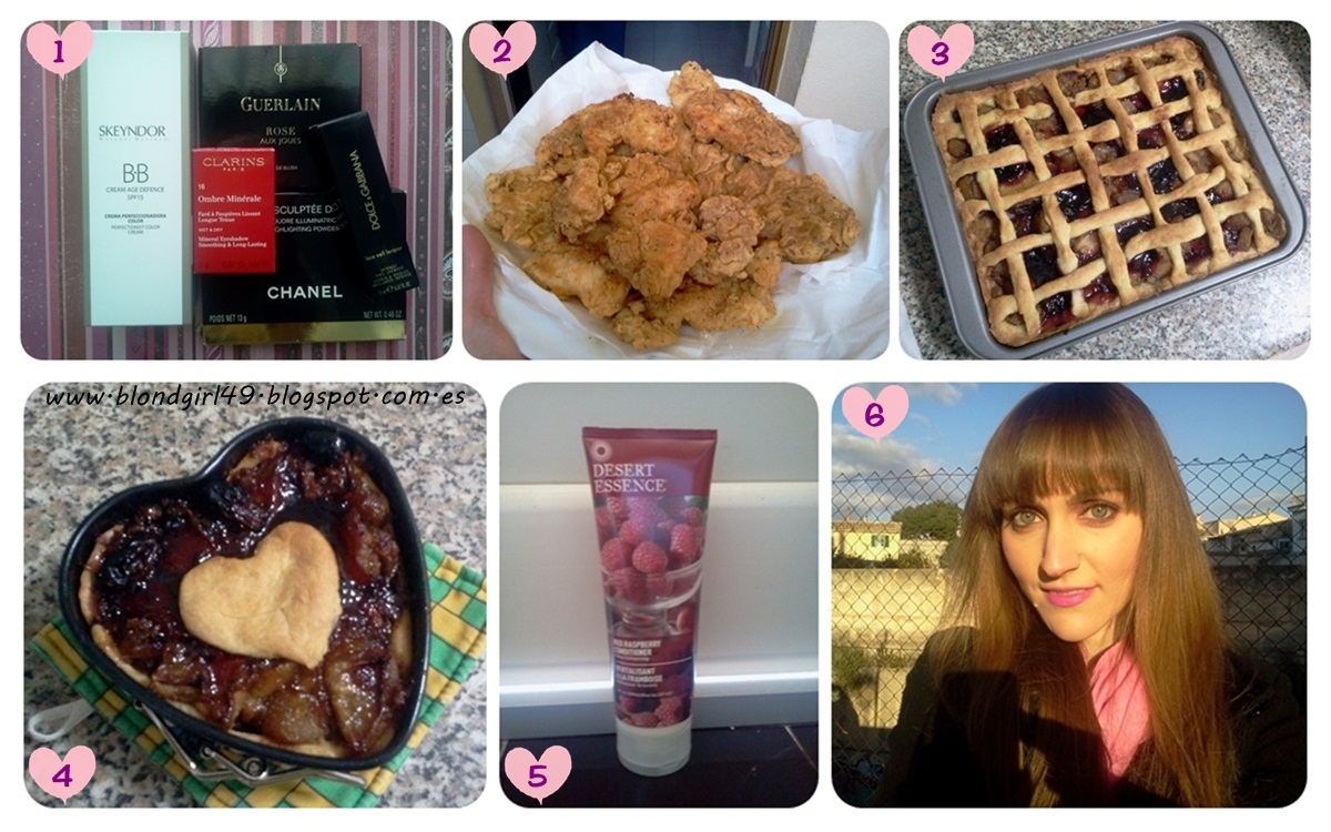 1. Regalitos que me envió Inma de Beautyvictim2. Pollo al estilo kentuky fried chicken, queda de vicio^^ (os tendría que poner la receta del rebozado porque está de muerte súbita!!!)3. Tarta de pasta flora rellena de manzana y frutos rojos, se la preparé a la abuela de mi chico por su cumple :)4. Con lo que sobró hice una minitarta para mi madre en forma de corazón jeje5. Mascarilla de frambuesas de Dessert Essence, lo compré en Iherb. Me encanta(L). Os conté mi experiencia comprando en Iherb en esta entrada.6. Fotito mía :)