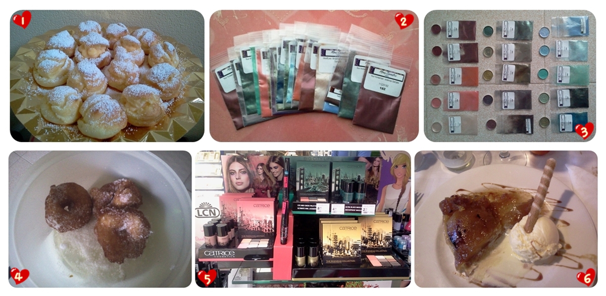 1. Los primeros buñuelos que hago en mi vida :D quedaron muy ricos!!! Los preparé para regalar a mi chico el día de las vírgenes (como hacíamos en el cole de peques que las niñas traían buñuelos y los nenes claveles xD), los hice rellenos de crema (se me hace la boca agua nada más por verlos xD). Os pondré recetita más adelante^^2. ¡¡Pedido de pigmentos!! No me quedé corta no xDD. Haré entradita contando mi experiencia de compra y también enseñando swatches, looks, etc3. Prensando los pigmentos que también os enseñaré entradita con lo que he usado e irá acompañada de vídeo!!!4. Los primeros buñuelos de viento que como este año jeje me los trajo la mami :), pero allí ya solo quedaban 3.. había muchos más!5. Fichada en el Müller la nueva edición limitada de Catrice! Son 3 paletitas super cucas con un esmalte por paleta (pero se venden por separado)6. El postre que me pedí cuando fui a comer con mi papi^^, es la tarta tatín (pastel de manzana asada) que la sirven calentita con una bola de helado (nunca he hecho pero quiero probar de cocinarla :D)