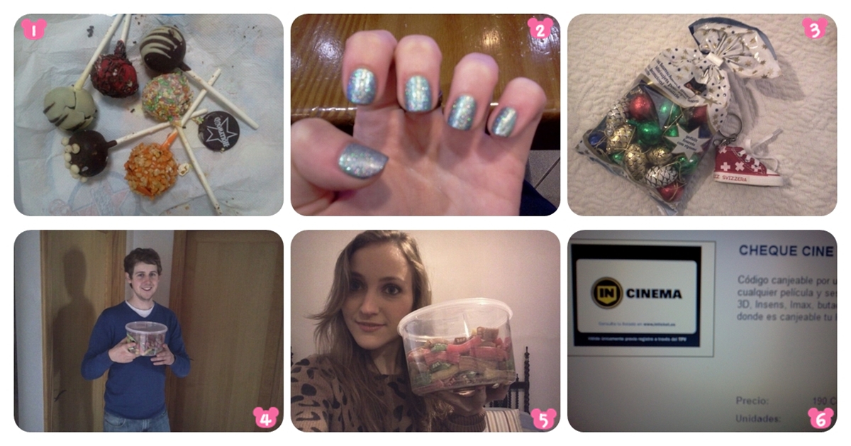 1. Chupa chups de mousse de chocolate o mazapán cubiertos de chocolate con decoraciones comestibles, venían en un postre del Foster's (me los trajo la mami que el Xoxo -su pareja vamos- no los quería).2. Look uñil cuquísimo, es una pena que no se distinga bien (cuando suba looks de uñas este lo mostraré pero con fotos de la cámara digital)3. Regalitos que me trajeron los papis de mi chico de Suiza :D: un llavero y bombones suizos (que eran igualitos que los lindt...sí sí, como bien leéis ERAN jajajaja ya han pasado a mejor vida :P)4 y 5. Mi chico y yo con un bote enorme de ladrillos de pica pica jajaja, los compró mi chico en el Müller :)6. Dos entradas gratis para el cine :D, las he conseguido con una web de encuestas pero que son de valorar hipermercados, estaciones de servicio y algunos sitios de comida rápida. Hay que hacerle una foto al tíquet de compra y te hacen 10 preguntas que tienes que valorar numéricamente (del 1 al 10). Es super fácil de hacer, yo tengo la aplicación en el mvl porque me resulta más fácil para enviar la foto. Te dan puntos y luego los canjeas por premios^^, pero casi todo son regalos físicos (nada de paypal o tiquet compliments T_T). De todas maneras si alguien está interesada le puedo enviar una invitación (creo que sólo se puede acceder de esta manera) o hacer una entrada explicando más detalladamente todo.