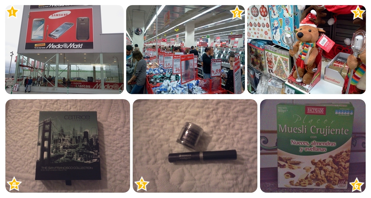 1. y 2. Primer Media Markt en Mallorca :D, estaba llenísimo de gente y es verdad que algunas ofertas son buenísimas.3. Muñeco navideño que canta y baila jajaja, encima super marchoso!4. Paletita de Catrice que me compró mi chico el finde siguiente de haber visto las paletas jejeje, tiene 2 colores en especial que me encantan. También os la tengo que enseñar y hacer looks^^5. Compritas de la edición limitada de Twilight de Essence, es un pigmento moradito con base negra y un eyeliner transparente con purpurina también morada. Os los enseñaré :)6. Mis "cereales" preferidos! en verdad es muesli jajaja, yo me los tomo con la leche y a veces también sin nada, me tienen super viciada, me paso el día picando u.u', lleva trozos grandecitos de frutos secos riquísimos (nueces, avellanas y almendra). RECOMENDADISIMOS! Están de muerte :D, los venden en Mercadona y, si no recuerdo mal, cuestan 1,75€