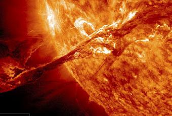 Eyección de materia a partir de las capas exteriores de la atomósfera solar, a una velocidad de 1500 m/s. Si llegara a la tierra podría afectar a su campo magnético, causar auroras y tormentas magnéticas, afectando a los satélities y a las telecomunicaciones.