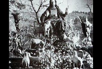 En esta fotografía podemos ver a la Divina Pastora en el camarín sin sombrero, con diadema y cayado liso de plata. Se trata de una añeja fotografía de 1929 que fue muy difundida en aquellos años, junto a la Virgen aparece su primitivo grupo de ovejas y el san Miguel destruido en 1936; el Pastorcito que se ve en la foto es el que acompañaba siempre a la Virgen en el camarín. Las pinturas son las de Ricardo López Cabrera de 1901.El año en que se realizó la fotografía, estrenó la Virgen la actual diadema de salida, ejecutada en oro y donada por Doña Pastora Solis Villalobos.