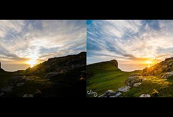 A la izquierda, una fotografía con un HDR demasiado pronunciado, que ha provocado halos en los bordes de las montañas y en las texturas. A la derecha, la misma fotografía con un HDR más sutil y realista