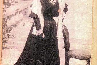 La señora luce un bonito y elegante vestido que, curiosamente, encargó para presenciar en Madrid el paso de la comitiva de la boda de Alfonso XIII con Victoria Eugenia de Battenberg celebrada el día 31 de mayo de 1906.