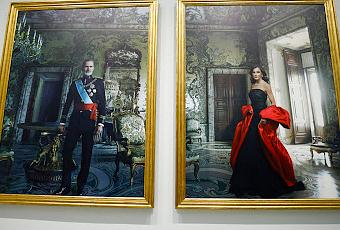 “Ante el díptico de Leibovitz, mi primera impresión fue que me encontraba no en el Salón Gasparini del Palacio Real sino en un oscuro caserón lleno de polvo y telarañas, con las paredes recubiertas de lepra y los muebles a punto de desmoronarse. El rey está inclinado, casi volcado por la penumbra y el peso de tantas condecoraciones, y tiene que agarrarse a una mesa para no caerse, mientras que la reina, acariciada de espaldas por la luz, parece una modelo de alta costura que acaba de entrar por el balcón. Casi de inmediato me vino a la cabeza el parlamento de Pedro Briones, el mendigo prácticamente ciego, amigo de Velázquez, a quien el pintor le explica el boceto de Las Meninas en el drama de Buero Vallejo: ‘Un cuadro sereno, pero con toda la tristeza de España dentro. Quien vea a estos seres comprenderá lo irremediablemente condenados al dolor que están. Son fantasmas vivos cuya verdad es la muerte. Quien los mire mañana lo advertirá con espanto... Sí, con espanto, pues ya no sabrá si es él el fantasma ante la mirada de estas figuras’…Velázquez colocó otro espejo en el vértice de Las Meninas y difuminó a los reyes en su azogue, mientras Leibovitz ha metido en el suyo un opulento vacío, un infinito de reflejos superpuestos uno tras otro.