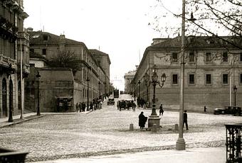 Al fondo de la imagen, se descubre la cornisa del Palacio Real, prácticamente el único capaz de sobrevivir al infatigable paso del tiempo. ¡Cuánto ha cambiado este pedacito de Madrid!